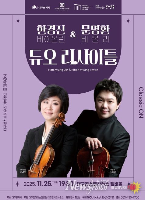 뉴스펀치 조평훈 기자 | 대구콘서트하우스 기획공연 ‘클래식 ON’ 11월 무대는 ‘바이올리니스트 한경진 · 비올리스트 문명환 듀오 리사이틀’로, 오는 11월 25일(화) 오후 7시 30분 챔버홀에서 열린다.