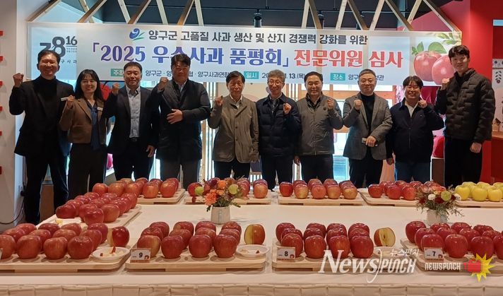 뉴스펀치 김길룡 기자 | 지난 13일 양구군 사과홍보관에서 열린 ‘2025 우수 사과 품평회’에서 이성일씨(양구읍) 농가가 2년 연속 대상을 차지했다.