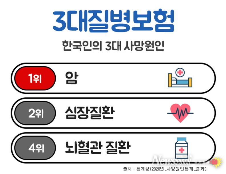 뉴스펀치 조은별 기자 | 3대질병으로 일컬어지는 암, 뇌혈관질환, 심혈관질환은 한국인의 주요 사망원인에서 상위를 차지하고 있으며, 이에 대한 진단비를 집중적으로 보장해 주는 보험상품을 3대질병진단비 보험이라 할 수 있다.