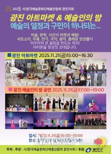 뉴스펀치 김완규 기자 | 광진구가 11월 21일 광진구청 대강당에서 광진예술문화단체총연합회(회장 강구원)가 주관하는 ‘제13회 광진 예술인의 밤’을 개최한다.