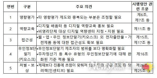 한편, 「디지털 포용법 시행령」 제정안 입법예고는 이번 주 금요일(11.21)까지 진행될 예정이며, 제정안에 대해 의견이 있는 경우 국민 참여 입법센터나 이메일 등을 통해 의견을 제출할 수 있다.