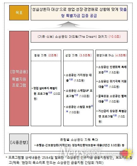 지난 ’25.9.4일 금융위는 성실상환 소상공인을 대상으로 창업, 성장, 경영애로 등 상황에 맞는 특별자금을 공급하는 10조원 규모의 ‘소상공인 더드림(The Dream) 패키지’를 발표한 바 있다. 대책발표 이후, 준비 과정을 거쳐 각 상품을 순차적으로 출시하고 있으며, 최근(11.7일) 마지막 2개 상품, 기업은행의 ‘소상공인 가치성장대출(1.5조원)’과 ‘골목상권 소상공인 활력대출(1.0조원)을 출시하였다.