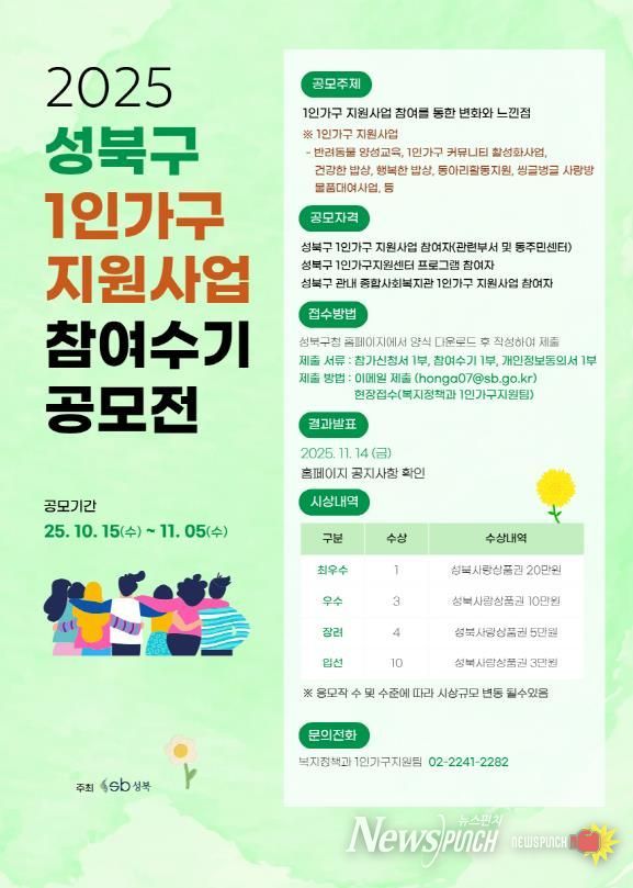 뉴스펀치 김완규 기자 | 서울 성북구가 ‘1인가구 지원사업 참여수기 공모전’을 마무리하고 총 18편의 수상작을 선정했다고 14일 밝혔다. 이번 공모전은 성북구가 추진한 1인가구 지원사업에 참여한 주민들의 생생한 경험을 공유하고, 지역 내 우수 사례를 발굴하기 위해 기획됐다.