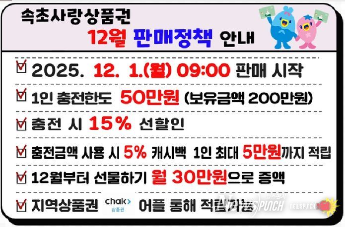 뉴스펀치 김길룡 기자 | 속초시가 속초사랑상품권의 12월 판매 정책을 일부 조정해 오는 12월 1일부터 시행한다.