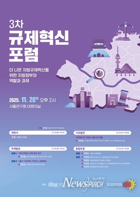 뉴스펀치 김완규 기자 | 서울연구원과 (사)좋은규제시민포럼은 11월 20일 오후 2시, 서울연구원 2층 대회의실에서 ‘더 나은 지방규제혁신을 위한 지방정부의 역할과 과제’를 주제로 '3차 규제혁신 포럼'을 공동 개최한다.