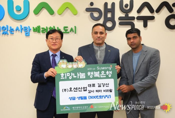 뉴스펀치 조평훈 기자 | 대구 수성구는 ㈜오션산업 김강산 대표가 지난 14일 지역의 어려운 이웃을 위해 성금과 생필품 500만 원 상당을 기탁했다고 밝혔다.