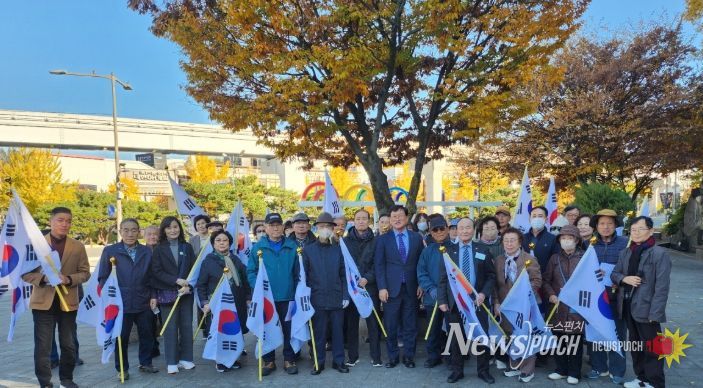 뉴스펀치 조평훈 기자 | 대구광역시지부 수성구지회(지회장 박근용)는 지난 14일 수성못 두산폭포광장에서 광복 80주년을 기념해 ‘나라사랑 태극기 달기’ 캠페인을 실시했다.
