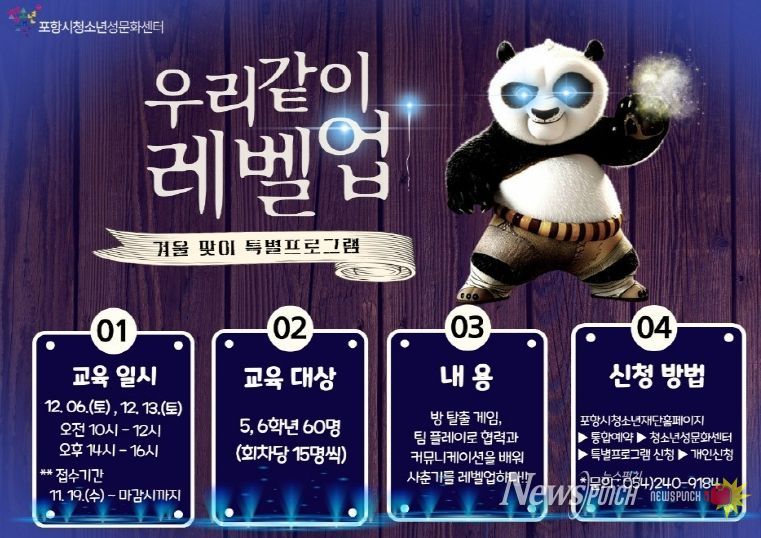 뉴스펀치 김길룡 기자 | 포항시청소년재단은 초등학교 5·6학년 청소년들의 사춘기 적응을 돕기 위해 겨울맞이 특별 성교육 프로그램 ‘우리 같이 레벨업’ 참가자를 모집한다고 18일 밝혔다.