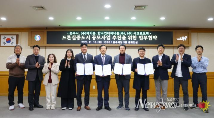 뉴스펀치 김길룡 기자 | 충주시는 18일 충주시청 중회의실에서 ㈜아이온, ㈜KCP, ㈜에코로보텍과 함께‘2026년 드론실증도시 구축사업’의 성공 추진을 위한 다자간 업무협약(MOU)을 체결했다.