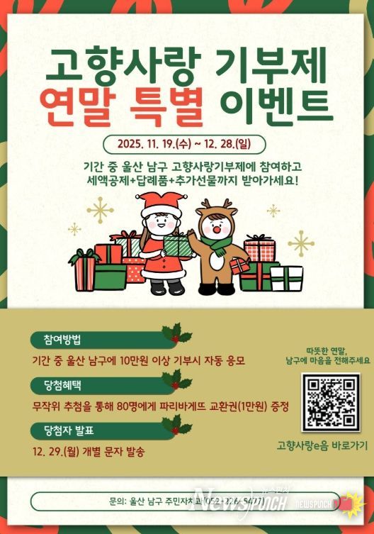 뉴스펀치 김길룡 기자 | 울산 남구가 19일부터 다음 달 28일까지 연말정산 시즌을 맞아 고향사랑기부제에 대한 관심을 더욱 유도하기 위해 특별 이벤트를 진행한다.