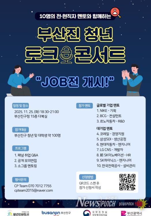 뉴스펀치 김길룡 기자 | 부산진구는 오는 11월 25일, 청년들의 실전 취업역량 강화를 위해 ‘2025년 부산진청년토크콘서트-JOB전 개시!’를 개최한다고 밝혔다.
