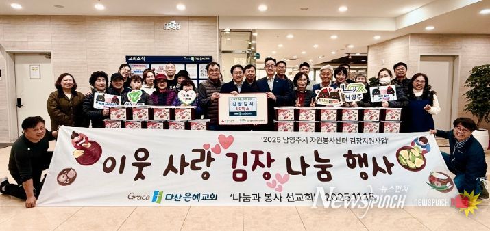 뉴스펀치 김길룡 기자 | 남양주시는 15일 다산은혜교회가 직접 담근 김장김치 80박스를 다산1동 지역사회보장협의체에 기탁했다고 밝혔다.