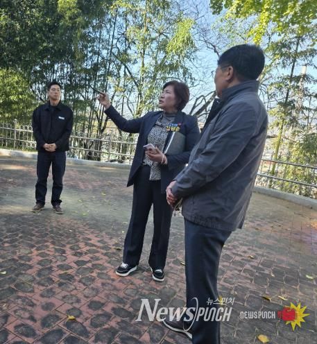 뉴스펀치 김길룡 기자 | 고성군의회 김원순 의원은 지난 14일 남산공원 내 ‘푸른 쉼터’가 장기간 사용되지 않고 있고, 벽화가 방치되어 지저분하다"는 등의 고성읍 주민 민원을 접수받고, 녹지공원과장 및 담당 공무원들과 함께 현장 점검을 실시했다.