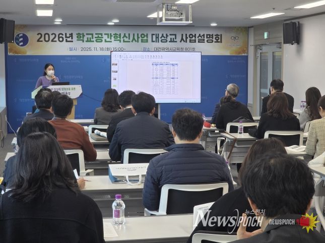 뉴스펀치 김길룡 기자 | 대전시교육청은 11월 18일 2026년 학교공간혁신사업의 원활한 추진을 위해 대상학교 교장 및 교감, 교무부장, 행정실장, 시설업무담당자 등을 대상으로 사업설명회를 개최했다고 밝혔다.