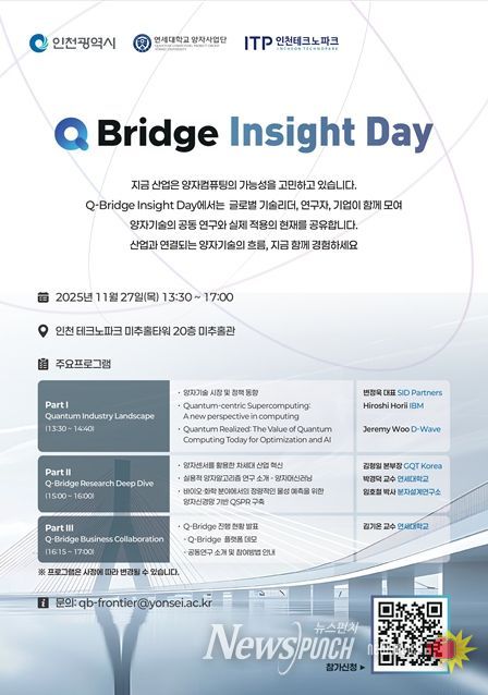 뉴스펀치 조평훈 기자 | 인천광역시는 오는 11월 27일 인천테크노파크 미추홀타워에서 연세대학교 양자사업단, 인천테크노파크와 공동 주관으로 ‘Q-Bridge Insight Day’를 개최했다고 밝혔다.