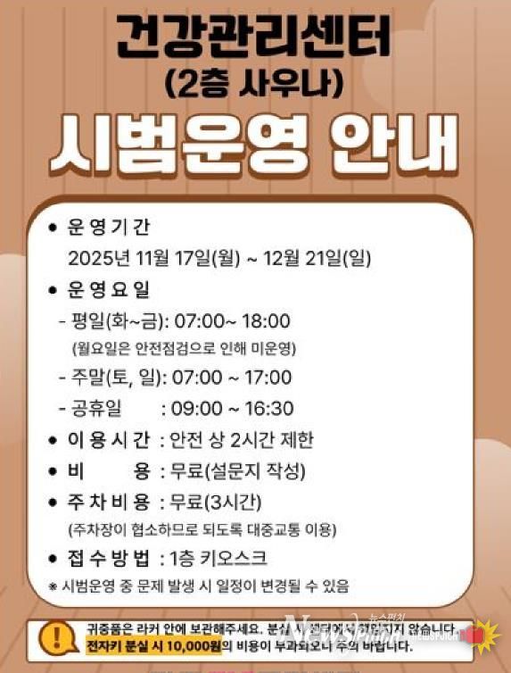 시범운영 기간 동안 건강관리센터는 평일 오전 7시부터 오후 6시까지, 주말에는 오전 7시부터 오후 5시까지, 공휴일에는 오전 9시부터 오후 4시 30분까지 운영되며, 매주 월요일은 안전점검으로 인해 휴무한다.