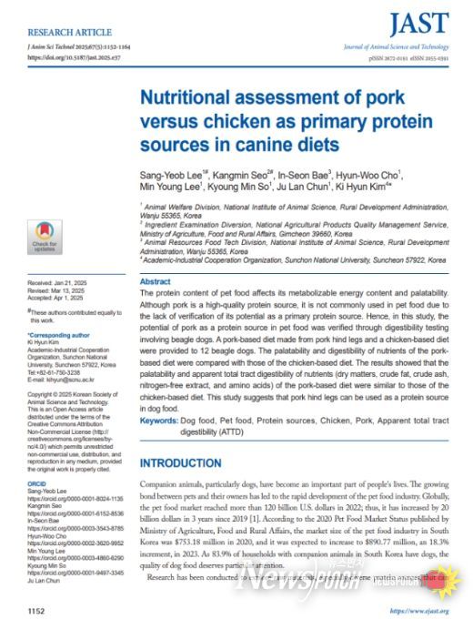 연구진은 비글견 12마리에게 닭고기 기반 사료와 돼지고기 뒷다리살을 단백질원으로 제조한 시험 사료를 각각 15일간 급여한 후, 소화율과 기호성을 비교 평가했다.