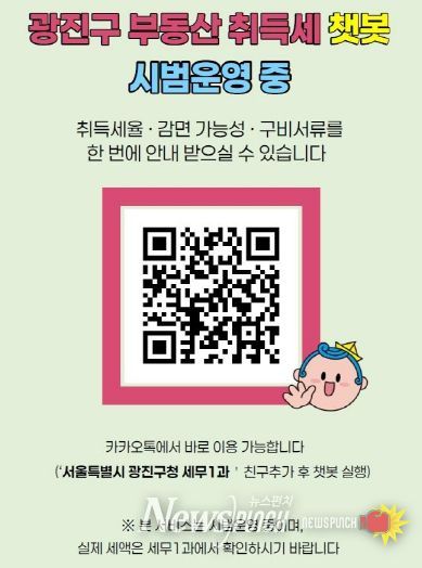 뉴스펀치 김완규 기자 | 광진구가 부동산 정책 변화에 따른 취득세 감면 확대와 직접 신고 증가에 대응하기 위해 카카오톡 기반 ‘부동산 취득세 안내 채팅로봇’을 시범 운영한다.