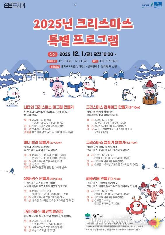 뉴스펀치 김길룡 기자 | 원주시 샘마루도서관은 크리스마스를 맞아 오는 12월 13일부터 21일까지 ‘크리스마스 특별 프로그램’을 운영한다.