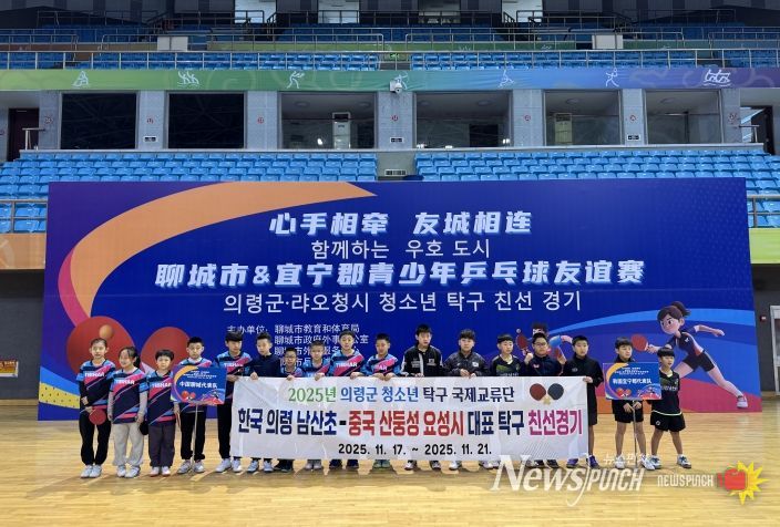 뉴스펀치 김길룡 기자 | 의령군 남산초등학교 탁구부 학생들이 세계 탁구 강국 중국을 찾아 국제 청소년 교류전을 펼쳤다. 의령군은 17일부터 4박 5일 동안 남산초 탁구선수 7명을 포함한 교류단이 자매도시 요성시를 방문해 친선 경기와 교류 프로그램을 진행했다고 20일 밝혔다.