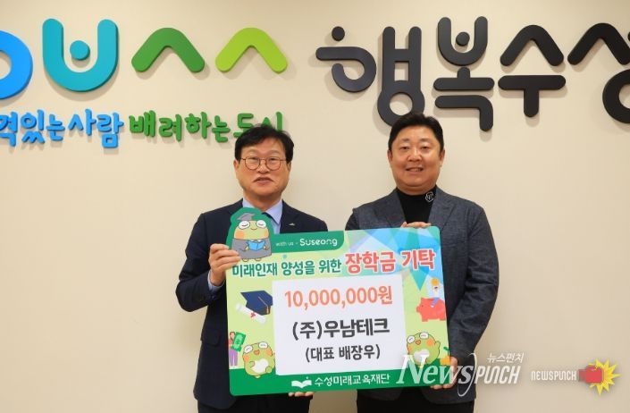 뉴스펀치 조평훈 기자 | ㈜우남테크(대표 배장우)는 지난 18일 미래인재 육성과 지역 교육경쟁력 강화를 위해 장학후원금 1천만 원을 수성미래교육재단(이사장 김대권)에 기탁했다.