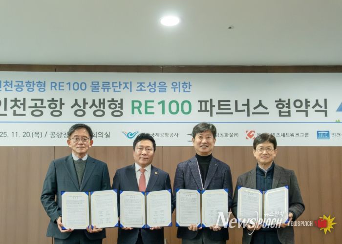 뉴스펀치 조평훈 기자 | 인천국제공항공사는 20일 오전 공항청사 회의실에서 물류단지 입주기업 3개社와 함께 ‘상생형 RE100 파트너스 업무협약(MOU)’을 체결했다고 밝혔다.