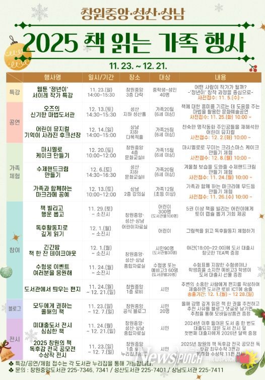 뉴스펀치 김길룡 기자 | 창원특례시 성산도서관과는 가족이 함께하는 독서문화 확산과 책 읽는 분위기 조성을 위하여 11월 23일부터 12월 21일까지 ‘책 읽는 가족’ 행사를 운영한다.