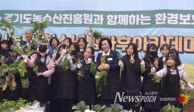 뉴스펀치 김길룡 기자 | 경기도의회 정윤경 부의장(더불어민주당, 군포1)은 20일 군포시청소년수련관 청소년방과후아카데미에서 열린 ‘도시농부 청소년방과후아카데미 옥상텃밭 활동 보고회’에 참석해 프로그램에 참여한 청소년들을 격려하고, 옥상텃밭에서 수확한 작물로 함께 김치를 담그며 뜻깊은 시간을 보냈다.