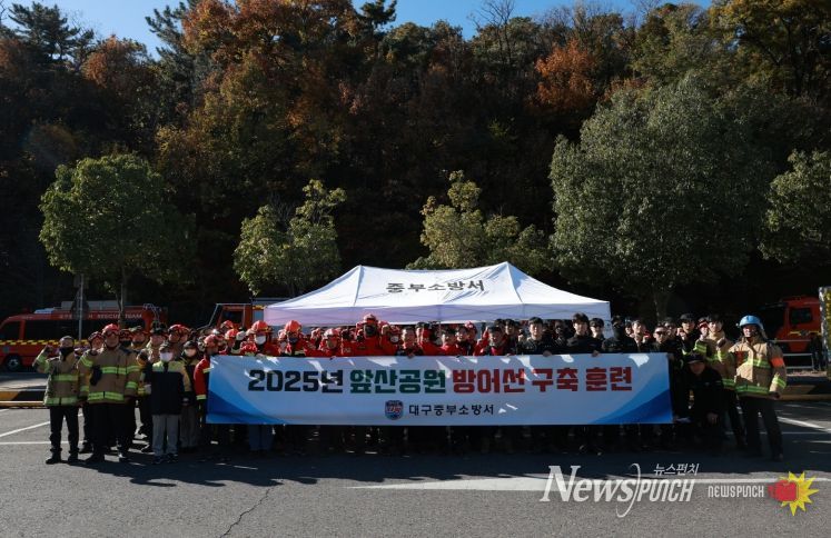 뉴스펀치 조평훈 기자 | 대구중부소방서는 11월 21일 남구 앞산공원 전역에서 대규모 산불 확산을 차단하기 위한 유관기관 합동 방어선 구축 훈련을 실시했다.