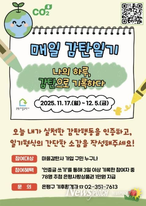 뉴스펀치 김완규 기자 | 서울 은평구는 지난 17일부터 내달 5일까지 주민들이 일상 속에서 탄소중립 행동(감탄행동)을 실천하고 기록하며, 긍정적 경험과 친환경 실천을 연결하도록 돕는 ‘매일 감탄일기 – 나의 하루, 감탄으로 기록하다’ 프로그램을 진행한다고 밝혔다.
