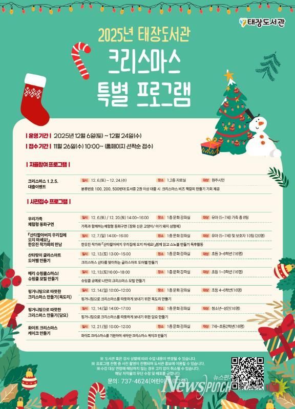 특별 프로그램으로 태장도서관 도서를 대출하면 크리스마스 책갈피 만들기 기회를 제공하는 ‘크리스마스 1.2.5. 대출 이벤트’, 유아와 가족이 함께 동화 속 여행을 떠날 수 있는 ‘우리가족 체험형 동화구연’, 그림책 작가와 함께 책을 읽고 독후활동으로 책에 대한 흥미를 돋우는 ‘산타할아버지 우리집에 오지 마세요!, 한유진 작가와의 만남’ 등이 진행된다.