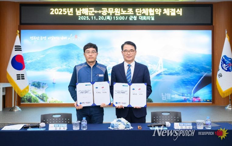뉴스펀치 김길룡 기자 | 남해군은 20일 군청 대회의실에서 전국공무원노동조합 경남지역본부 남해군지부와 상생과 협력을 위한 2025년 단체협약을 체결했다고 밝혔다.