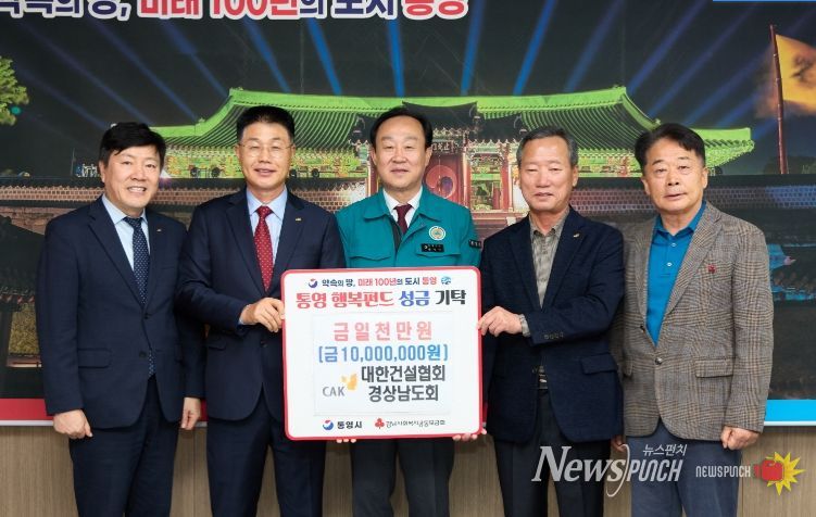 뉴스펀치 김길룡 기자 | 대한건설협회 경상남도회(회장 강동국)는 지난 20일 통영시에 이웃돕기 성금 1,000만원을 기탁하며, 지역 공동체를 지탱하는 또 하나의 버팀목이 되고자하는 뜻을 전했다.