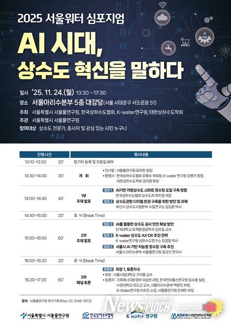 뉴스펀치 김완규 기자 | 서울시가 AI 기술을 활용한 상수도 혁신 방안을 모색하는 자리를 마련한다. 시는 11월 24일 오후 1시 30분부터 서울아리수본부 5층 대강당에서 ‘AI시대, 상수도 혁신을 말하다’를 주제로 ‘2025 서울워터 심포지엄’이 개최한다고 밝혔다.