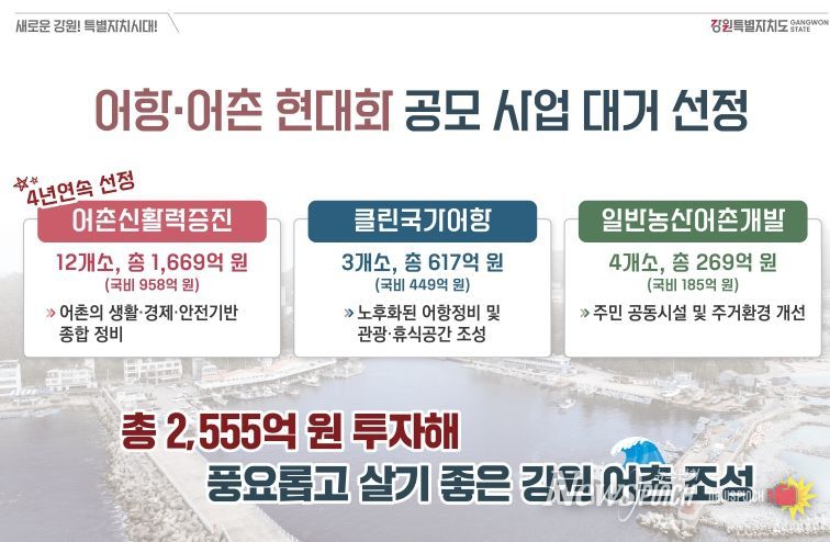 뉴스펀치 김길룡 기자 | 강원특별자치도는 해양수산부가 추진하는 어항・어촌 현대화 공모사업에 대거 선정됨에 따라, 2030년까지 총 2,555억 원(국비 1,592억 원)을 투입해 살기 좋은 강원어촌을 비전으로 본격적인 어촌 대전환을 추진하겠다고 밝혔다.