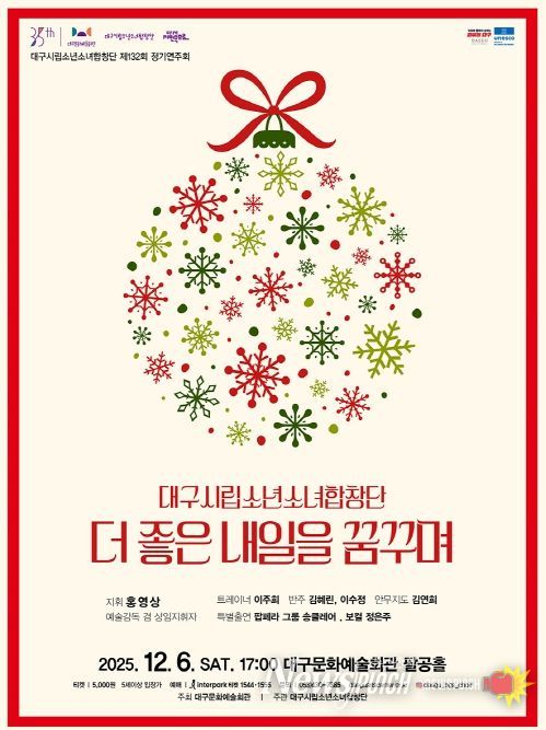 뉴스펀치 조평훈 기자 | 대구시립소년소녀합창단(예술감독 겸 상임지휘자 홍영상)은 오는 12월 6일 오후 5시, 대구문화예술회관 팔공홀에서 제132회 정기연주회 ‘더 좋은 내일을 꿈꾸며’를 개최한다.