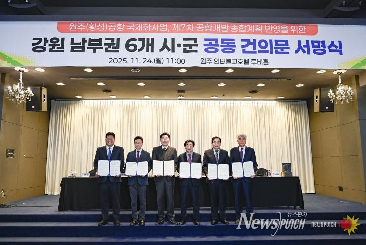 뉴스펀치 김길룡 기자 | 강원 남부권 6개 시군(원주·횡성·영월·평창·정선·태백)은 24일 오전 11시, 호텔인터불고 원주에서 국토교통부의 ‘제7차 공항개발 종합계획’에 ‘원주(횡성)공항의 국제화 사업 반영’을 요청하는 공동 건의문을 채택했다.