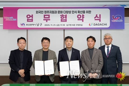 뉴스펀치 김길룡 기자 | 부산 남구는 지난 11월 21일, 남구청에서 ㈜월드다가치(대표 권해석)와 외국인 정주지원과 문화 다양성 인식 확산을 위한 업무협약(MOU)을 체결했다고 밝혔다.