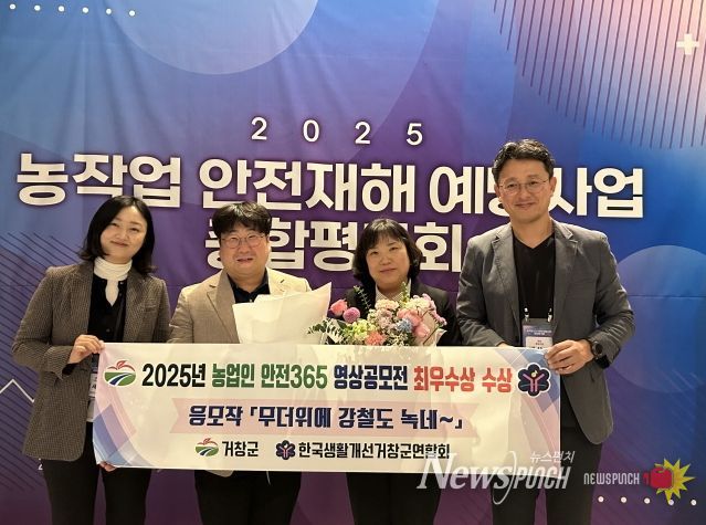 뉴스펀치 김길룡 기자 | 거창군은 지난 20일 농촌진흥청이 주최한 ‘2025년 농작업 안전재해 예방사업’ 종합 평가회에서 안전 365 캠페인 영상공모전에 한국생활개선거창군연합회(회장 윤진미)와 관의 협력으로 만든 영상이 최우수상을 수상했다고 밝혔다.