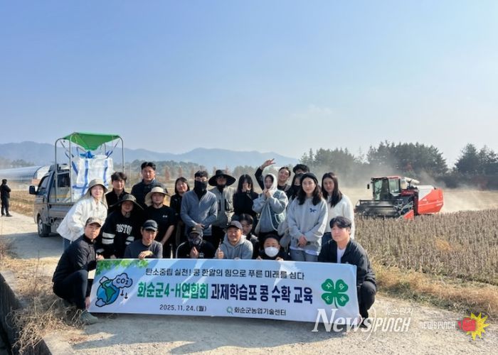 뉴스펀치 김길룡 기자 | 화순군은 24일 화순군4-H연합회가 화순군 도곡면에 있는 공동 과제학습포에서 콩 수확 과제교육을 진행했다고 밝혔다.