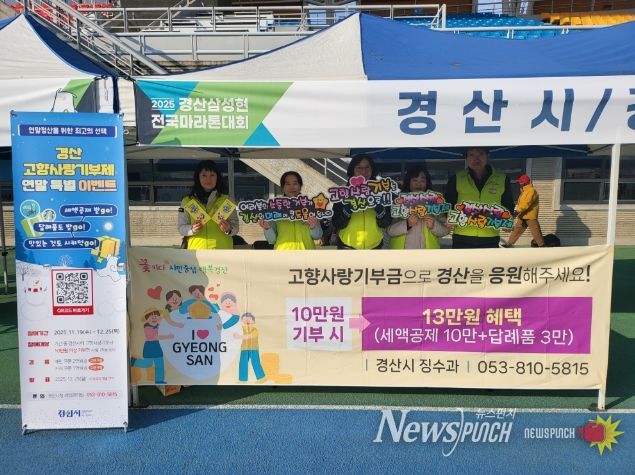 뉴스펀치 김길룡 기자 | 경산시는 23일 경산시민운동장에서 시작하여 경산시 일대를 돌아오는 2025 삼성현 전국 마라톤대회에서 경산 고향사랑기부제 홍보를 실시했다.