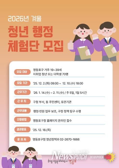 뉴스펀치 김완규 기자 | 영등포구가 겨울방학을 맞아 청년들이 실제 행정 현장을 경험하며 진로 탐색의 폭을 넓힐 수 있도록 ‘2026년 겨울 청년 행정체험단’을 운영하고, 오는 12월 10일까지 참여자를 모집한다고 밝혔다.