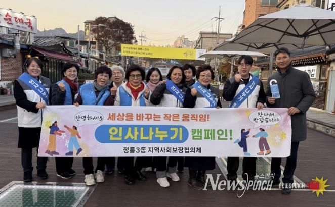 뉴스펀치 김완규 기자 | 서울 성북구 정릉3동 지역사회보장협의체가 지난 19일 삭막해지는 도심 속에서 이웃 간의 정을 나누고 복지 사각지대를 해소하기 위해 ‘인사나눔 캠페인’을 정릉시장 일대에서 진행했다.