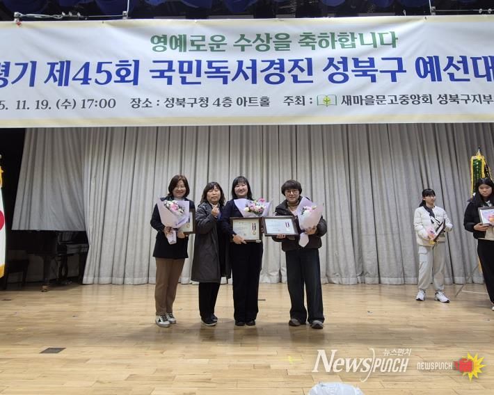 뉴스펀치 김완규 기자 | 서울 성북구 성북동 새마을문고가 지난 19일 성북구청 4층 아트홀에서 열린 대통령기 제45회 국민독서경진 성북구 예선대회 시상식에서 단체부 우수상과 개인부 장려상을 수상했다.