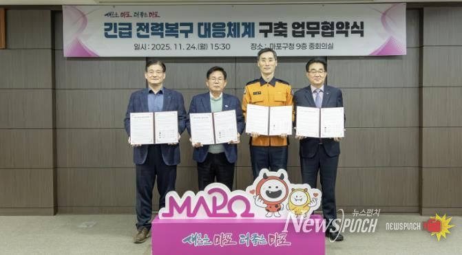 뉴스펀치 김완규 기자 | 마포구는 11월 24일 오후 3시 30분, 마포구청 9층 중회의실에서 마포소방서, 한국전력공사 마포용산지사, 한국전기안전공사 서울본부와 함께 ‘전력복구 대응 체계 구축을 위한 업무협약’을 체결했다.