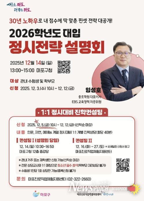 뉴스펀치 김완규 기자 | 마포구는 오는 12월 14일 마포구청에서 ‘2026학년도 정시 전략 설명회 및 1:1 진학 컨설팅’을 개최함에 따라, 이에 참여할 지역 내 수험생과 학부모를 사전 모집한다.