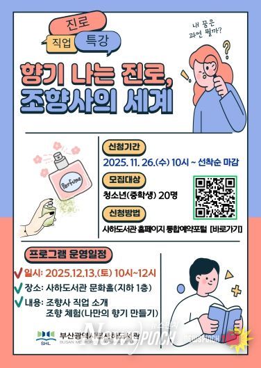 뉴스펀치 김길룡 기자 | 부산광역시립사하도서관(관장 김정남)은 오는 12월 13일 오전 10시부터 도서관 문화홀에서 중학생 20명을 대상으로 진로직업 특강 ‘향기나는 진로, 조향사의 세계’를 운영한다.