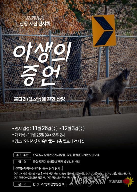 뉴스펀치 김길룡 기자 | ‘산양을 사랑하는 인제 사람들’과 ‘국립공원을지키는시민의모임’은 오는 11월 26일부터 12월 3일까지 인제산촌민속박물관 1층 필로티 전시실에서 ‘야생의 증언 – 울타리(철조망)에 갇힌 산양(천연기념물 제217호, 멸종위기 야생생물 1급)’ 사진전을 개최한다.