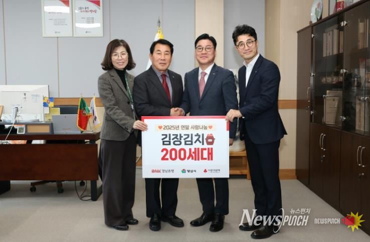 뉴스펀치 김길룡 기자 | BNK경남은행은 24일 양산시를 방문하여 지역 내 저소득 취약계층을 위해 김치 10kg 200세트(800만원 상당)를 기탁했다.