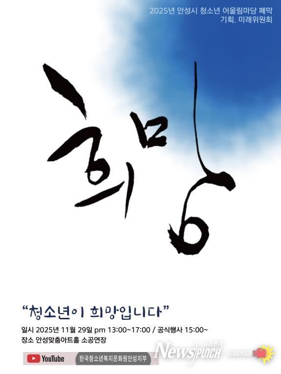 뉴스펀치 김길룡 기자 | 안성시는 오는 11월 29일, 안성맞춤아트홀 소공연장에서 2025 안성시 청소년 어울림마당 폐막식 ‘희망’을 개최한다.